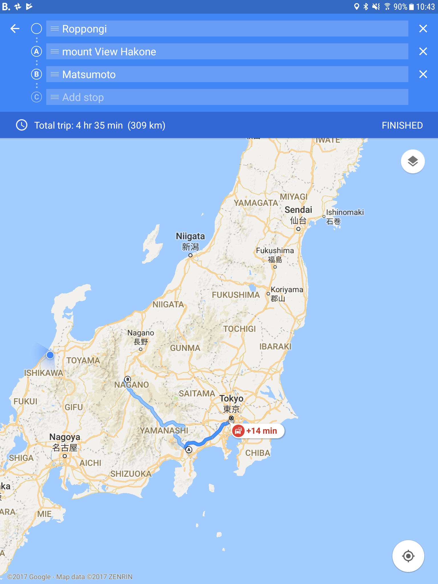 The train journey was approx five hours and involved heading back towards Tokyo.